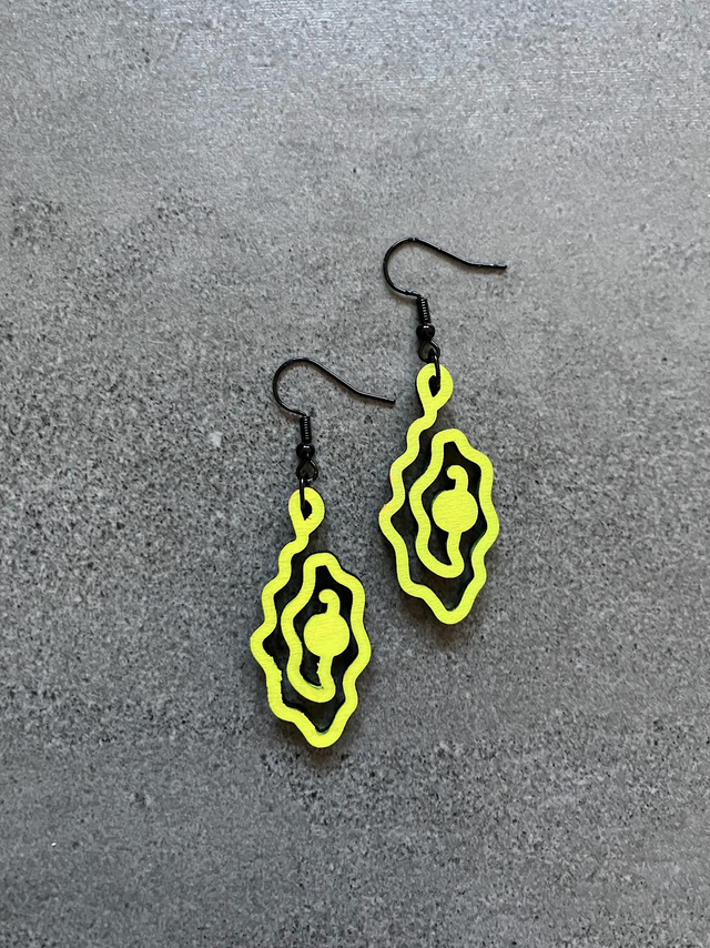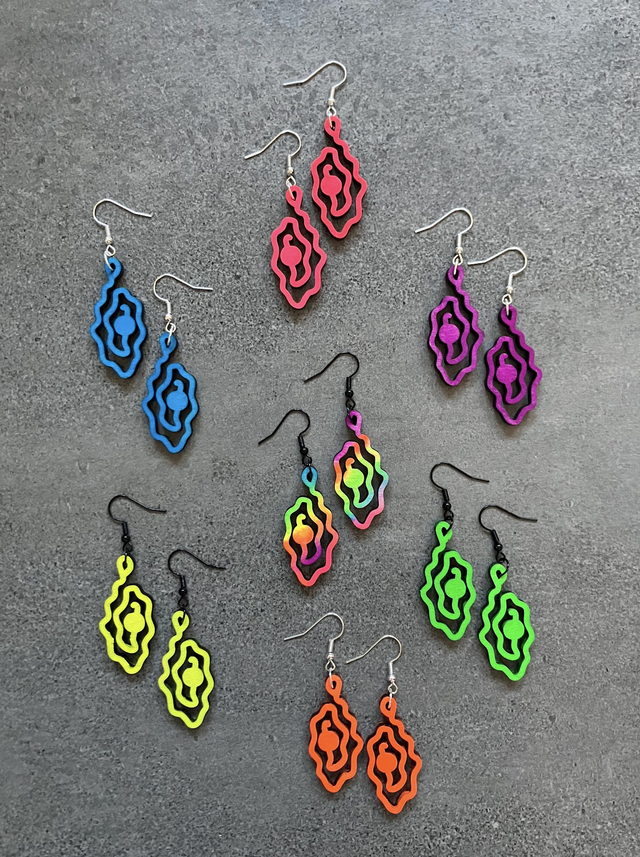 Die Vulva Perlen Laser-cut sind von mir handgefertigte Schmuckstücke aus Holz, elegant und leicht im Ohr zu tragen. Ich cutte aus Holz die von mir entwickelte Vulva Pearl und highlighte die Perle farblich. Auch mit UV-Farbe erhältlich.